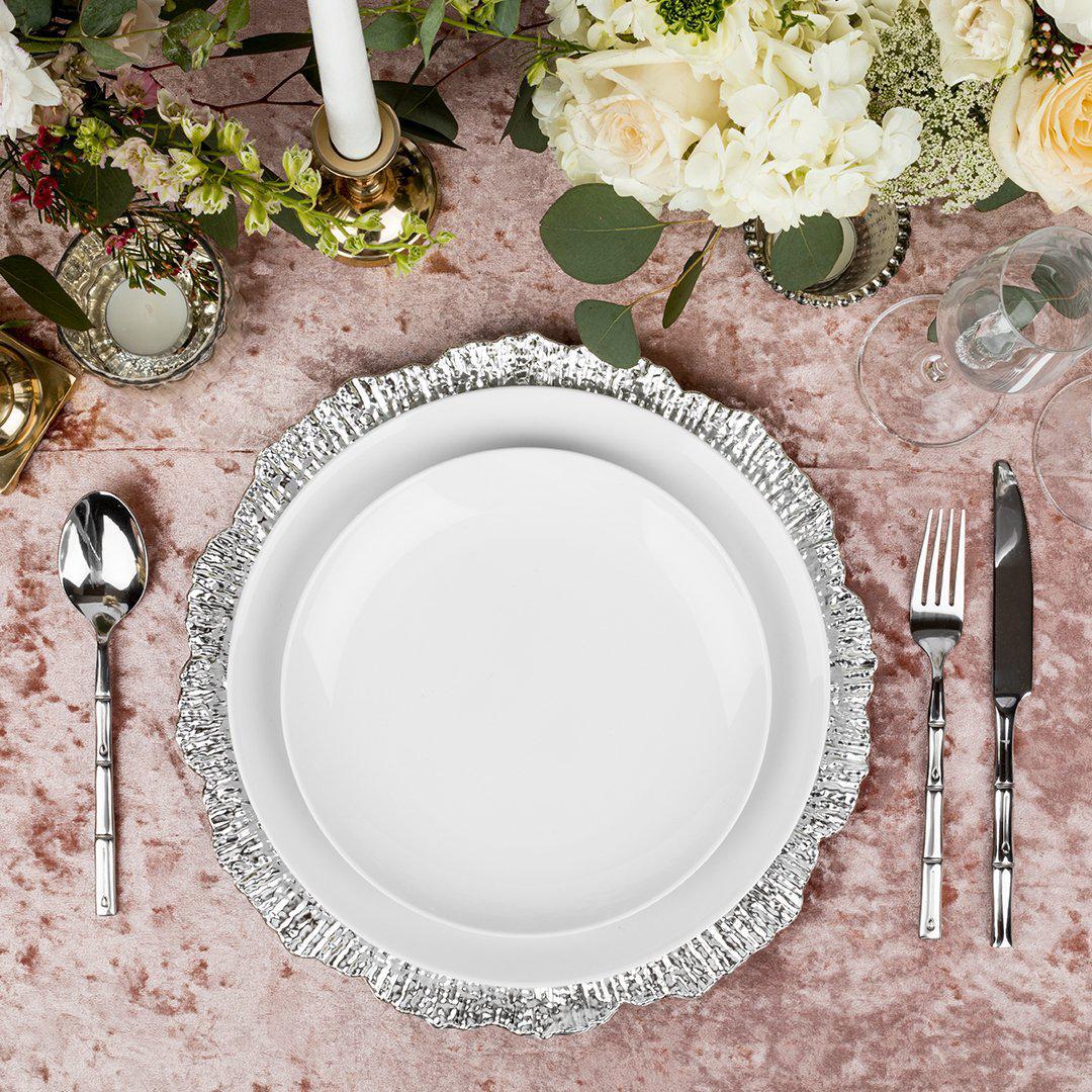 - WEDDING DÉCOR: Create memorable décor for your wedding reception with dramatic tablescape design. Whether planning a small or large event, a variety of different dinner plates would stand out paired with acrylic charger plates. For the unique, classic style, use the dramatic style plates under round plates. Wedding plates can take center stage as beautiful tabletop décor placed with our flora acrylic charger plates.