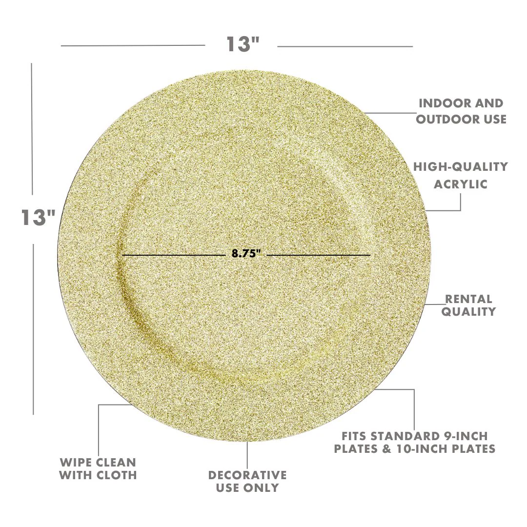 - BRING YOUR TABLE TO LIFE: Add a little touch of glam to your table ensemble using our glitter chargers. Boasting a large 13-inch diameter, this set of 4 or bulk pack set of 24 plastic glitter charger plates fits standard 9 and 10-inch kitchen plates. Get them in bulk quantities for upscale parties, wedding receptions, bridal showers, quinceaneras, holidays, and special events. Available in gold glitter and black glitter for a more dramatic look.