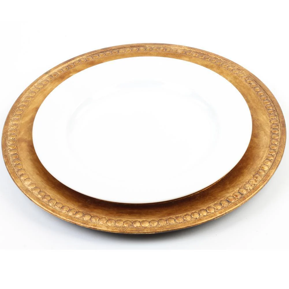 - Features distressed antique gold color. Decorative ornate beaded edge rim. The Grecian style charger plate is ideal for bohemian, and wanderlust tablescapes.
