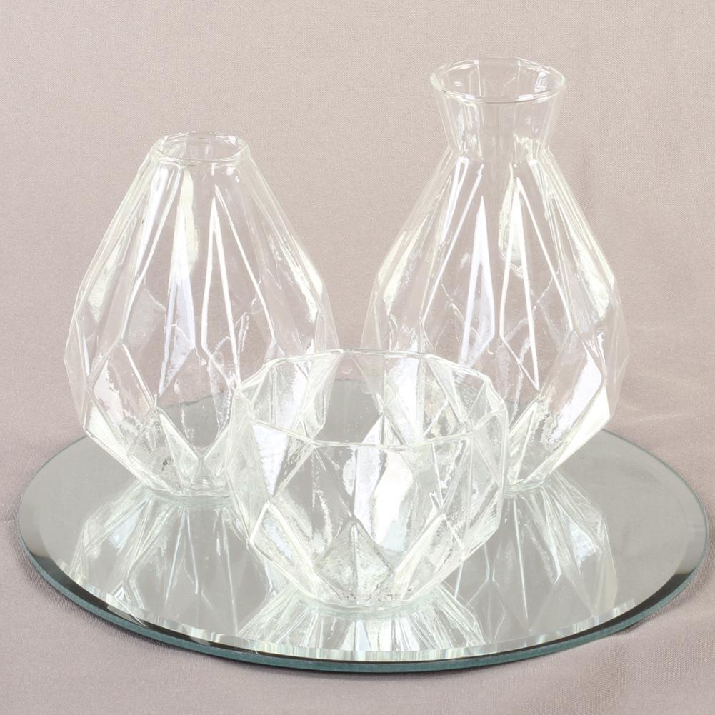 Looking for an effortless and budget friendly cocktail table centerpieces? Select our complete, ready to decorate high table decor, simply add flowers. Our modern bud vase centerpiece with 7.5 inch round bevel mirror is made of high quality glass. Each bud vase holder features facets that reflect light beautifully. Simply finish the centerpiece by adding your choice of floral arrangement and lighting. Use our functional cocktail table centerpiece for wedding cocktail hour to coffee table decor, end table decor, centerpiece graduation, centerpiece 50th birthday, centerpiece 90th birthday, bridal shower, baby shower and much more. Available in bud vase clear glass set and blush pink.
