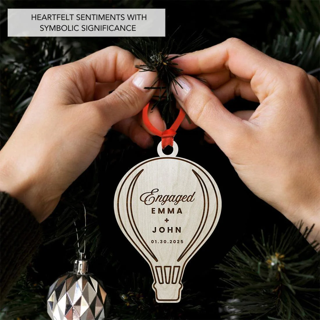 Custom Engaged Laser Engraved Wooden First Christmas Hot Air Balloon Ornament for Couples