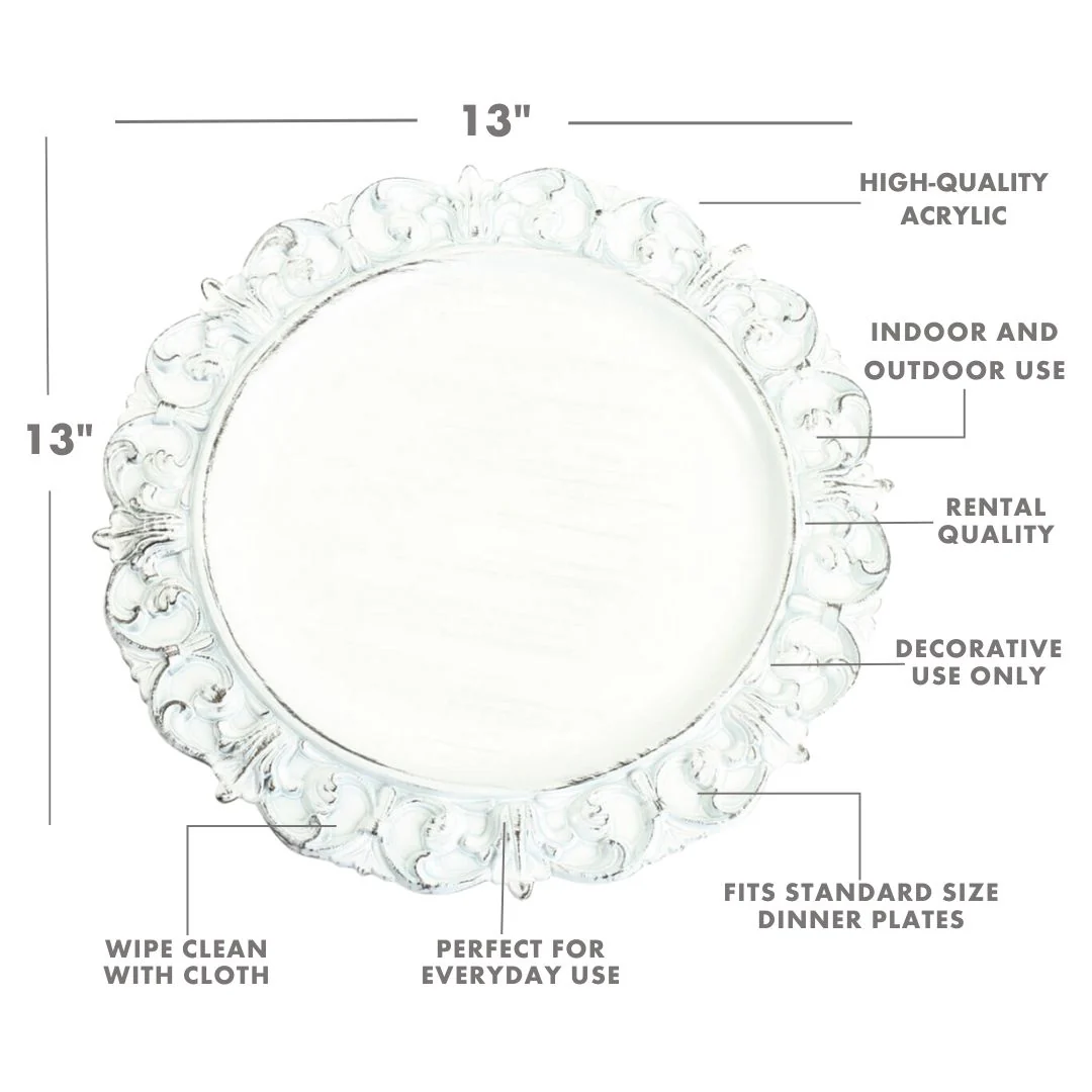 - 12 plates per pack. Add luxurious touch to your table with our elegant french provincial charger plate.