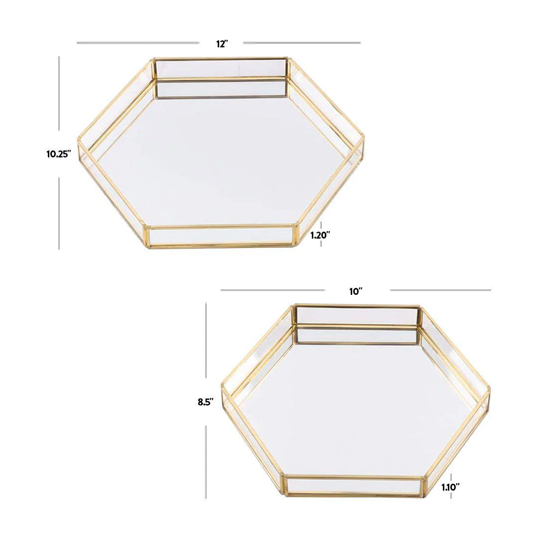 - Size Set of 2 hexagonal vanity glass and mirror trays, in one of each hexagon size - (1) 12 inch L x 10.25 inch W x 1.20 inch H and (1) 10 inch L x 8.5 inch W x 1.10 inch H