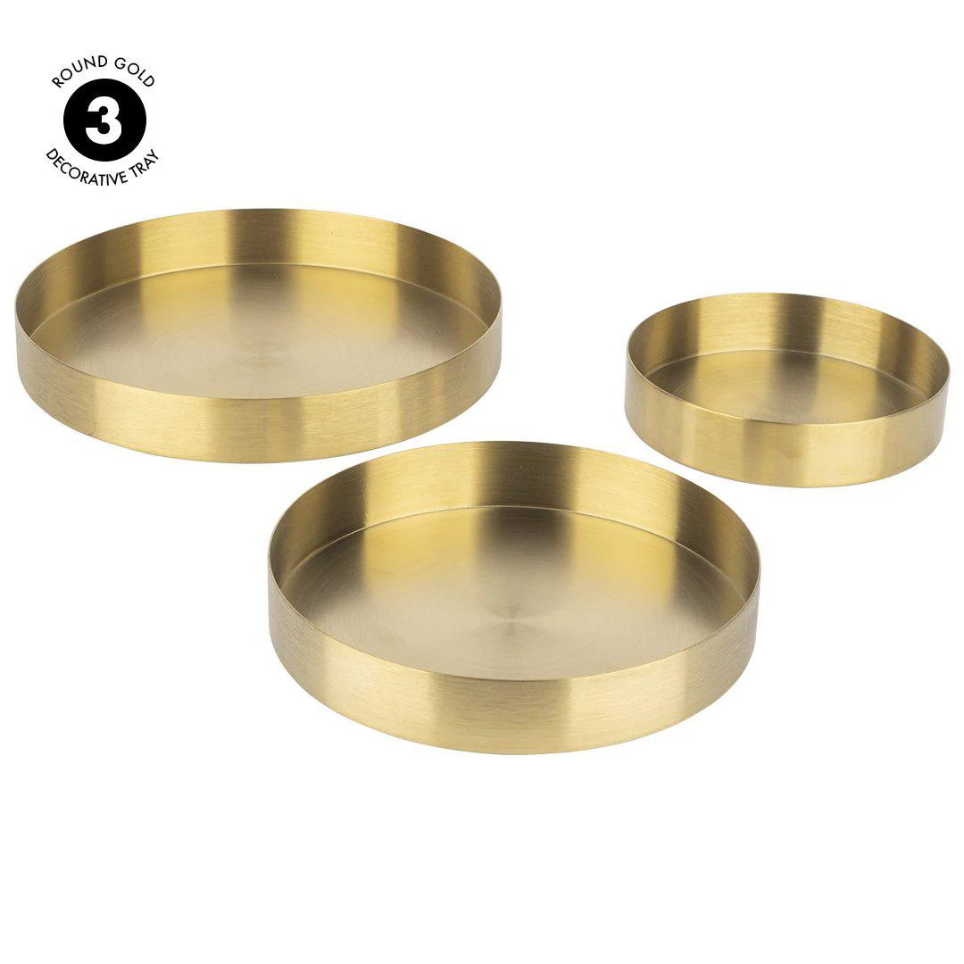 - MULTIPLE USES: These round gold metal trays have a variety of uses around the home, business, and for events. Place a decorative gold tray on your coffee table with vases, flowers, and candles as part of a beautiful centerpiece. For even more home decor, place as an ottoman tray to hold seasonal decor. Or use as a vanity tray in your bathroom to hold hairbrushes, makeup, and other items. Sold as a set of 3, these trays can be used at events to display food as a 3 tier serving plate.
