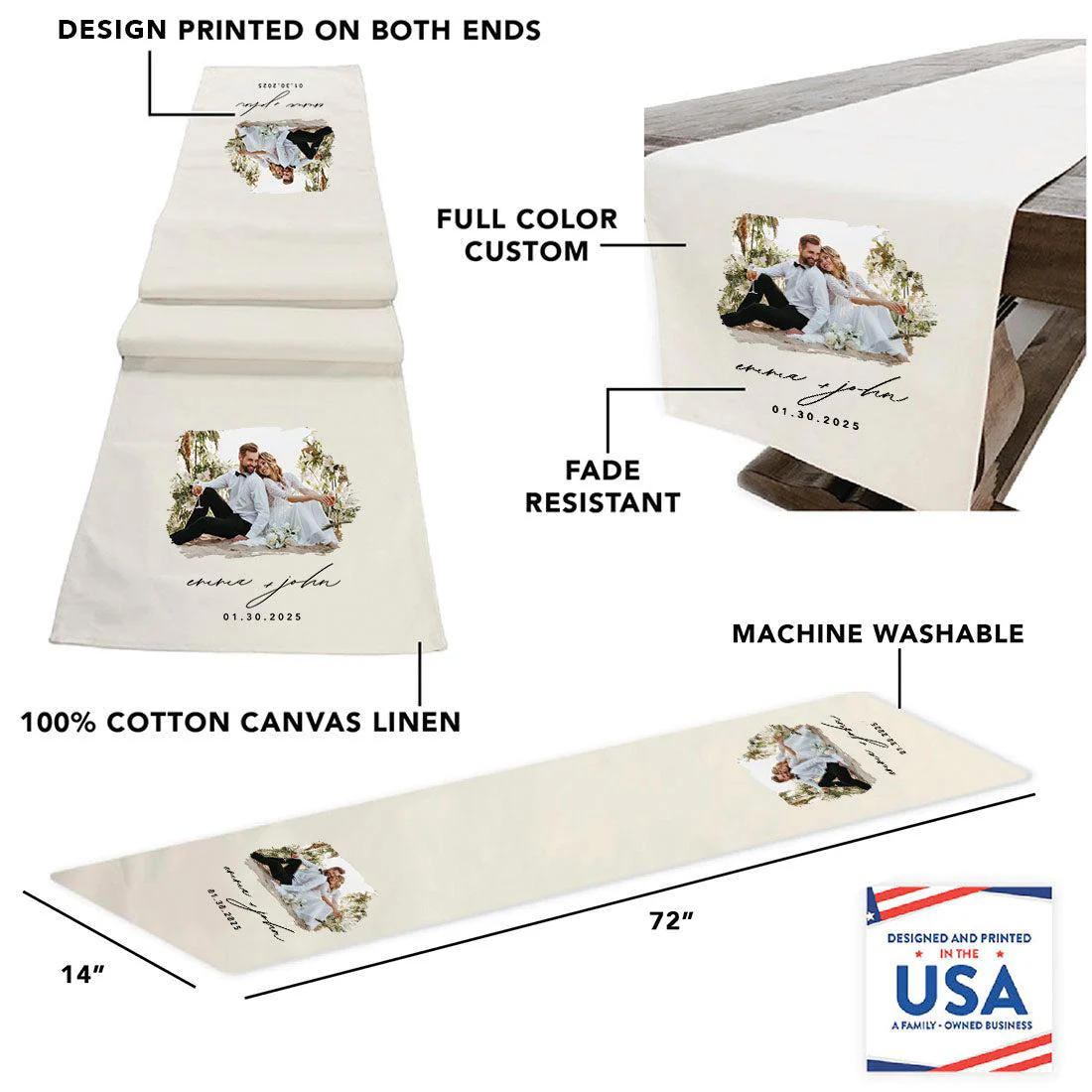 Custom Table Runner with Photo Text – Linen, Full Color for Wedding, Birthday, Baby Shower Bulk Pack