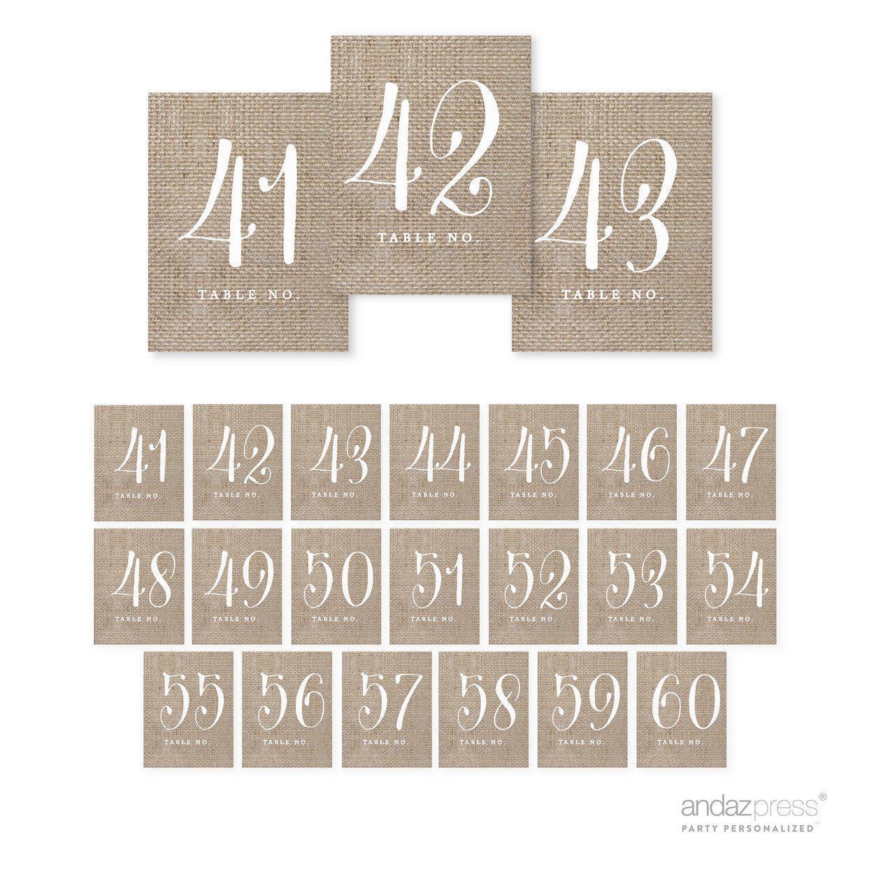 - Includes: 20 shabby chic burlap wedding table numbers. Each order includes 5 perforated cardstock sheets, with 4 table numbers each, for a total of 20 table numbers. With a little DIY effort, easily separate the table numbers from the heavy cardstock paper. Table number holder stand not included.