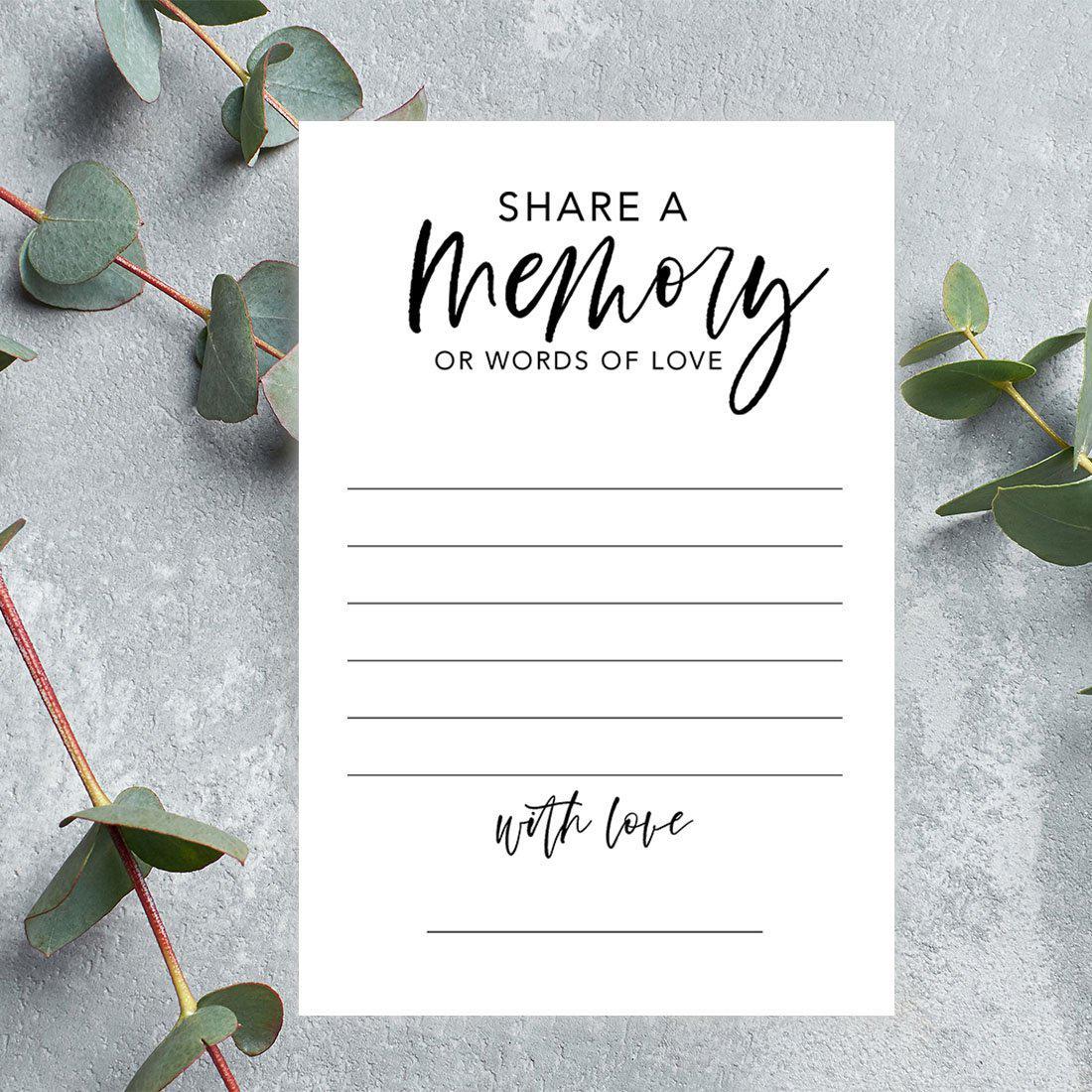 - Any Event: Not just for weddings, share a memory card that can be used for any event. Order 52-Pack shares a memory card for memorial services. Select the option for a photo version as remembrance cards and create space for guests to leave their memories at the funeral. These notecards can be used for anniversary parties, bridal showers, and birthdays. With your bridal shower decorations, add a table for guests to write advice to the bride. For retirement parties, guests can also fill in cards.