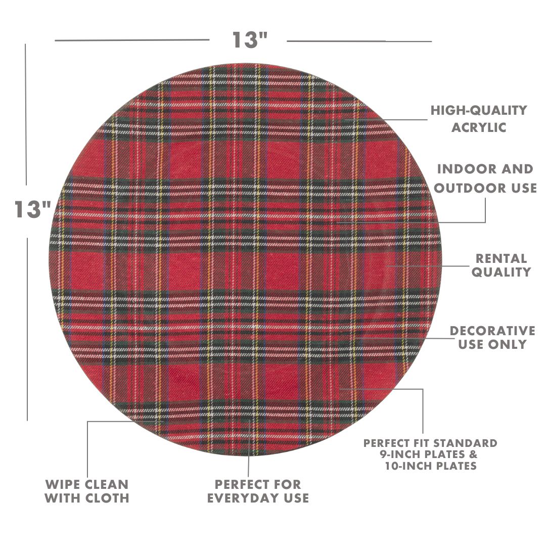 - A STURDY BASE FOR YOUR DINNERWARE: Safely hold your glass plates, ceramic, porcelain plates, or paper party plates, with our durable acrylic charger plates. Crafted with high-quality acrylic with an exclusive tartan plaid fabric overlay in red, brought to life with vivid detail and vibrant color finish. Each plate charger is made to resist breakage, chips, and cracks while catching food and spills in style. With a commercial quality, purchase in bulk for larger catered events.