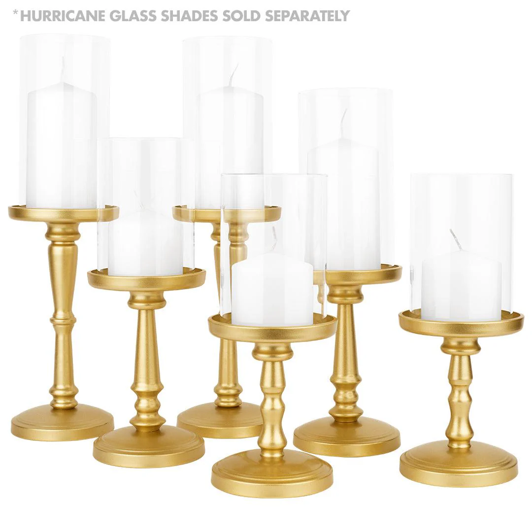 - WEDDING WOES NO MORE: Still can't find the right match for your wedding theme? Featuring a beautiful 6-piece candle pillar holder set, our metal pillar candle holders come in three sizes: 2 x small (4.5x6 inches), 2 x medium (4.5x7.5 inches), and 2 x large (4.5x10 inches). Choose from 3 different colors gold, champagne gold, or black to complete your tabletop needs. Easy Assembly Required.